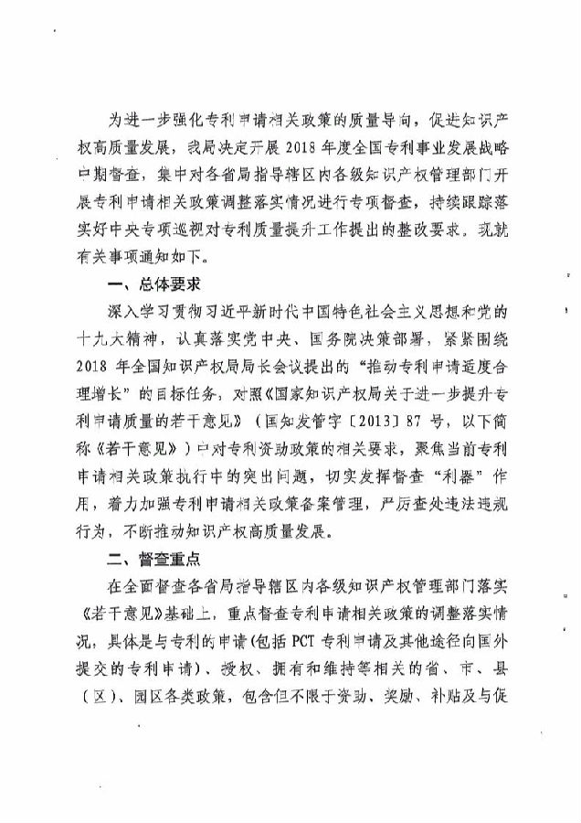 深入學(xué)習(xí)貫徹習(xí)近平新時代中國特色社會主義思想和黨的十九大精神,認(rèn)真落實黨中央、國務(wù)院決策部署,緊緊圍繞2018年全國知識產(chǎn)權(quán)局局長會議提出的“推動專利申請適度合理增長”的目標(biāo)任務(wù),對照《國家知識產(chǎn)權(quán)局關(guān)于進(jìn)一步提升專利申請質(zhì)量的若干意見》(國知發(fā)管字〔2013〕87號,以下簡稱《若干意見》)中對專利資助政策的相關(guān)要求,聚焦當(dāng)前專利申請相關(guān)政策執(zhí)行中的突出問題,切實發(fā)揮督查“利器”作用,著力加強專利申請相關(guān)政策備案管理,嚴(yán)厲查處違法違規(guī)行為,不斷推動知識產(chǎn)權(quán)高質(zhì)量發(fā)展。