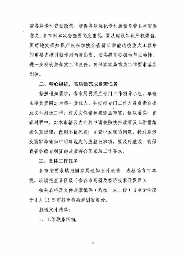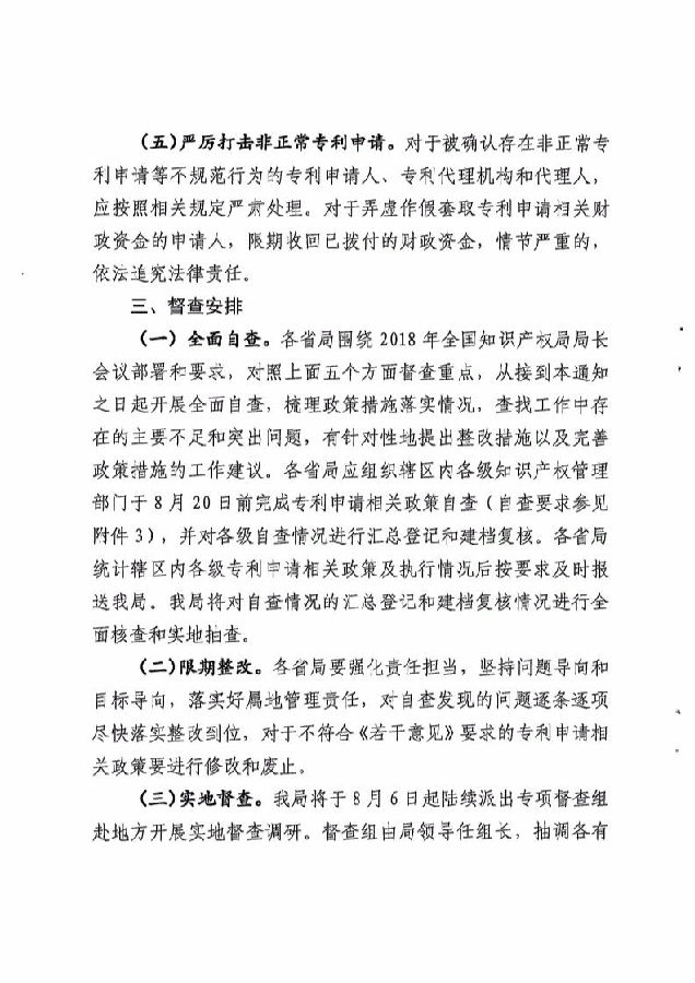 (一)全面自查。各省局圍繞2018年全國知識產(chǎn)權(quán)局局長會議部署和要求,對照上面五個方面督查重點,從接到本通知之日起開展全面自查,梳理政策措施落實情況,查找工作中存在的主要不足和突出問題,有針對性地提出整改措施以及完善政策措施的工作建議。各省局應(yīng)組織轄區(qū)內(nèi)各級知識產(chǎn)權(quán)管理部門于8月20日前完成專利申請相關(guān)政策自查(自查要求參見附件3),并對各級自查情況進(jìn)行匯總登記和建檔復(fù)核。各省局統(tǒng)計轄區(qū)內(nèi)各級專利申請相關(guān)政策及執(zhí)行情況后按要求及時報送我局。我局將對自査情況的匯總登記和建檔復(fù)核情況進(jìn)行全面核查和實地抽查。