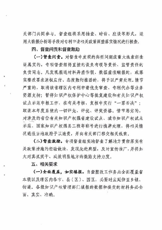 (一)督查問責(zé)。對督查中發(fā)現(xiàn)的典型問題或重大線索經(jīng)查證屬實的,專項督查組將直接約談負(fù)有領(lǐng)導(dǎo)責(zé)任、監(jiān)管責(zé)任的負(fù)責(zé)同志。凡發(fā)現(xiàn)報送材料弄虛作假、數(shù)據(jù)虛報瞞報的,或落實整改要求消極應(yīng)付、態(tài)度敷衍推諉的,將予以嚴(yán)肅處理。情節(jié)嚴(yán)重的,取消該省轄區(qū)內(nèi)專利申請優(yōu)先審查、專利代辦等業(yè)務(wù)資源支持;暫停知識產(chǎn)權(quán)保護(hù)中心等批復(fù)建設(shè)和有關(guān)知識產(chǎn)權(quán)試點示范申報工作,在有關(guān)考核、復(fù)核中實行“一票否決”取消本年度系統(tǒng)內(nèi)一切評先、評優(yōu)、評獎資格。情節(jié)惡劣的,對涉及的省份有關(guān)知識產(chǎn)權(quán)強省建設(shè)試點、城市知識產(chǎn)權(quán)試點示范、國家知識產(chǎn)權(quán)強縣工程等稱號進(jìn)行摘牌處理,將相關(guān)情況通報當(dāng)?shù)卣枰宰坟?zé),并向有關(guān)部門移交相關(guān)線索。