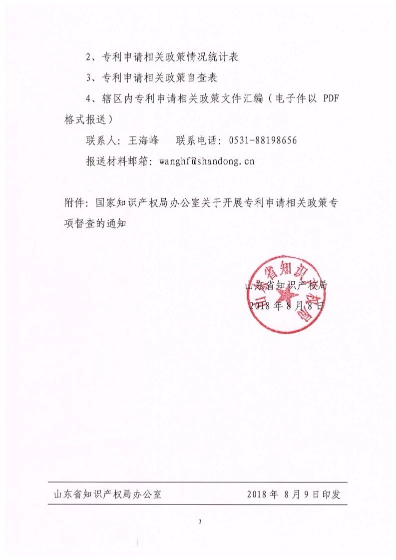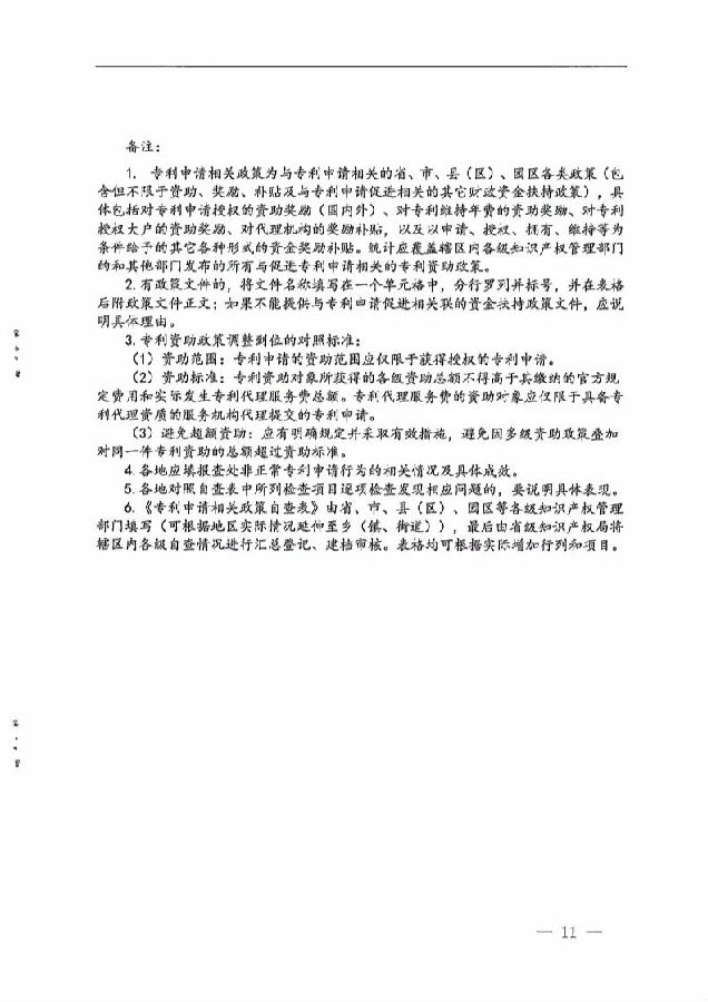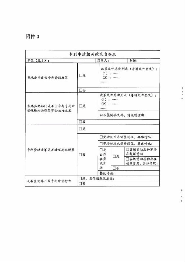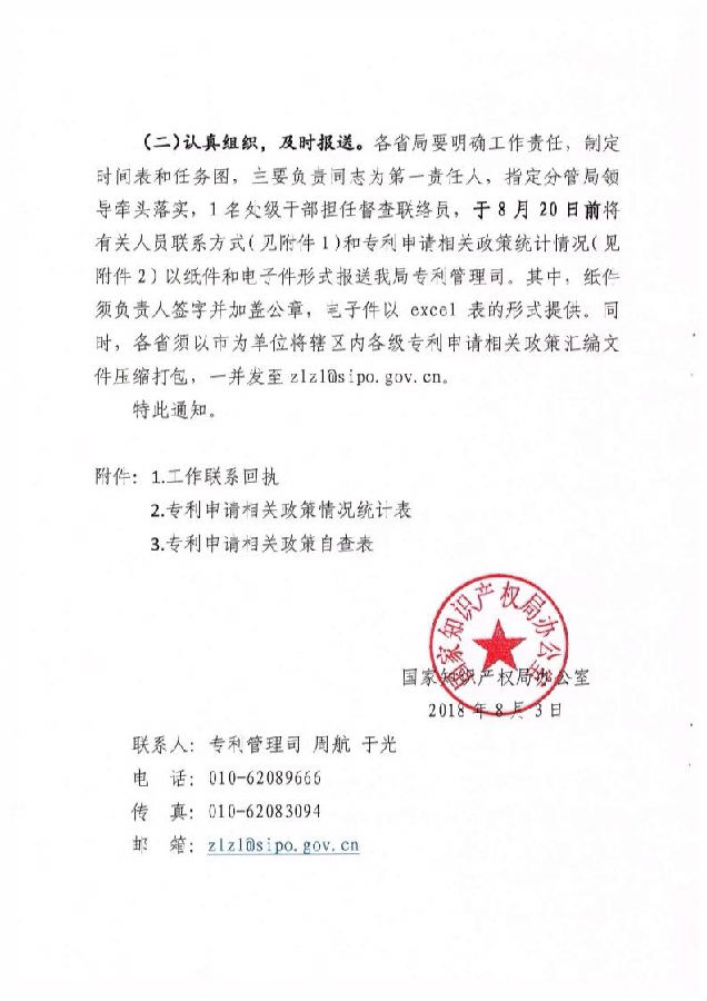 (二)認(rèn)真組織,及時報送。各省局要明確工作責(zé)任,制定時間表和任務(wù)圖,主要負(fù)責(zé)同志為第一責(zé)任人,指定分管局領(lǐng)導(dǎo)牽頭落實,1名處級干部擔(dān)任督查聯(lián)絡(luò)員,于8月20日前將有關(guān)人員聯(lián)系方式(見附件1)和專利申請相關(guān)政策統(tǒng)計情況(見附件2)以紙件和電子件形式報送我局專利管理司。其中,紙件須負(fù)責(zé)人簽字并加蓋公章,電子件以 excel表的形式提供。同時,各省須以市為單位將轄區(qū)內(nèi)各級專利申請相關(guān)政策匯編文件壓縮打包,一并發(fā)至z1 zas ipo.gov.cn。