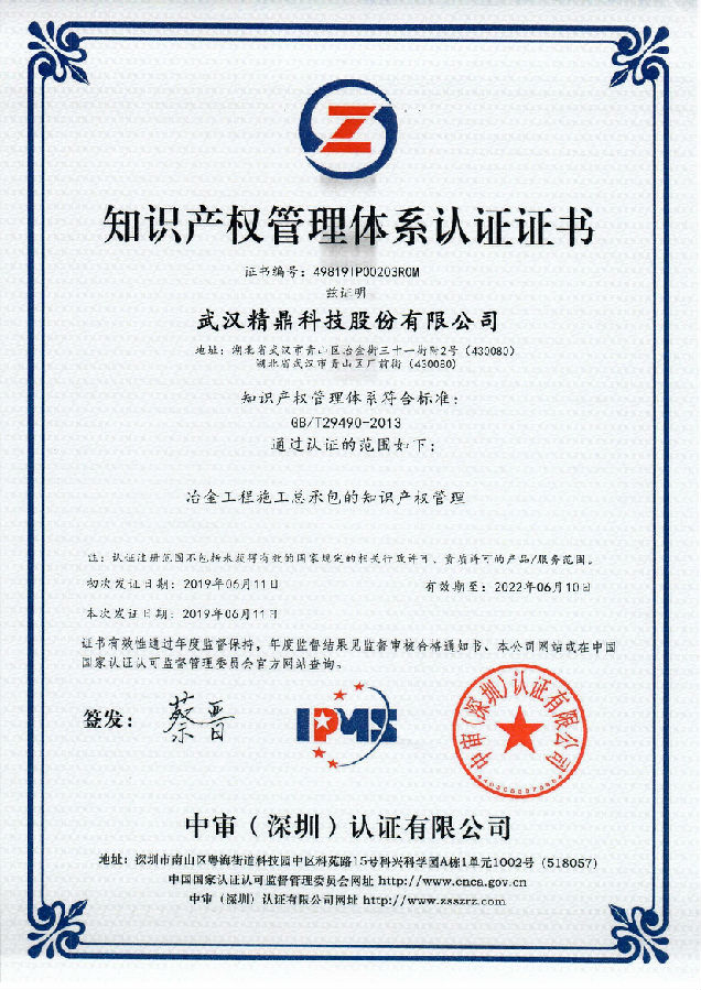 熱烈祝賀武漢精鼎科技股份有限公司于2019年9月獲得知識產(chǎn)權(quán)貫標(biāo)認(rèn)證證書,這意味著精鼎科技在知識產(chǎn)權(quán)領(lǐng)域獲得到重要認(rèn)可,在知識產(chǎn)權(quán)方面得到進(jìn)一步規(guī)范和在綜合競爭力得到進(jìn)一步提升。