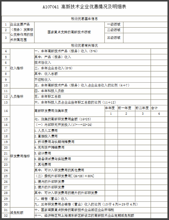 (3)A107041——高新技術(shù)企業(yè)優(yōu)惠情況及明細表